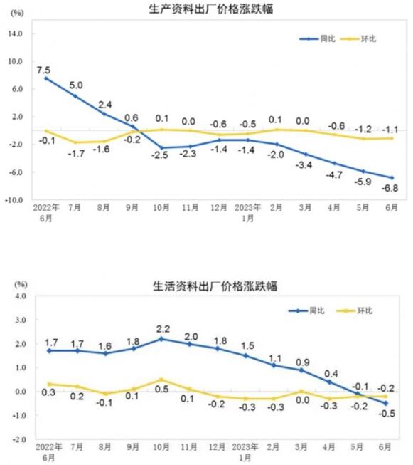 2023年6月份,全國工業生產者出廠價格同比下降5.4%,環比下降0.8%;工業生產者購進價格同比下降6.5%,環比下降1.1%。上半年,工業生產者出廠價格比上年同期下降3.1%,工業生產者購進價格下降3.0%。