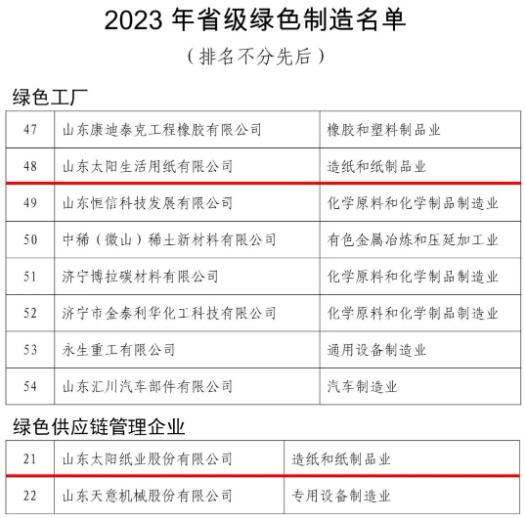 日前,山東省工信廳發布關于公布2023年(第一批)省級綠色制造名單的通知,經申報單位自我評價、市級工信部門評估推薦、專家論證、征求省級相關部門意見和社會公示等程序,確定105家企業為省級綠色工廠、10家園區為省級綠色工業園區、41家企業為省級綠色供應鏈管理企業,其中,山東太陽紙業股份有限公司入選省級綠色供應鏈管理企業,山東太陽生活用紙有限公司入選省級綠色工廠。