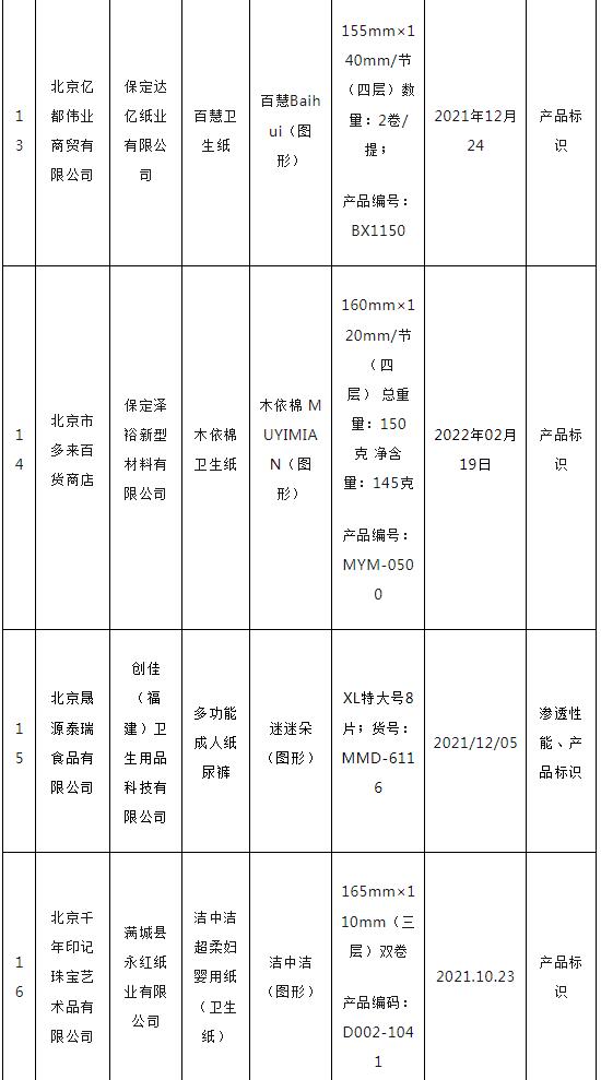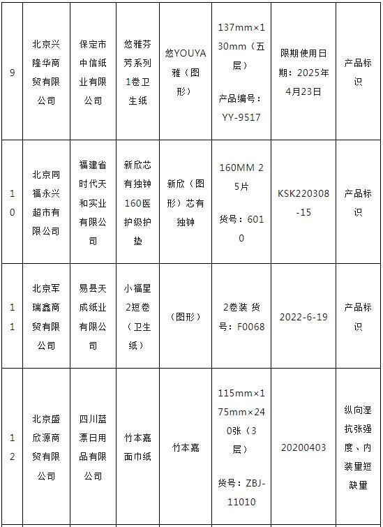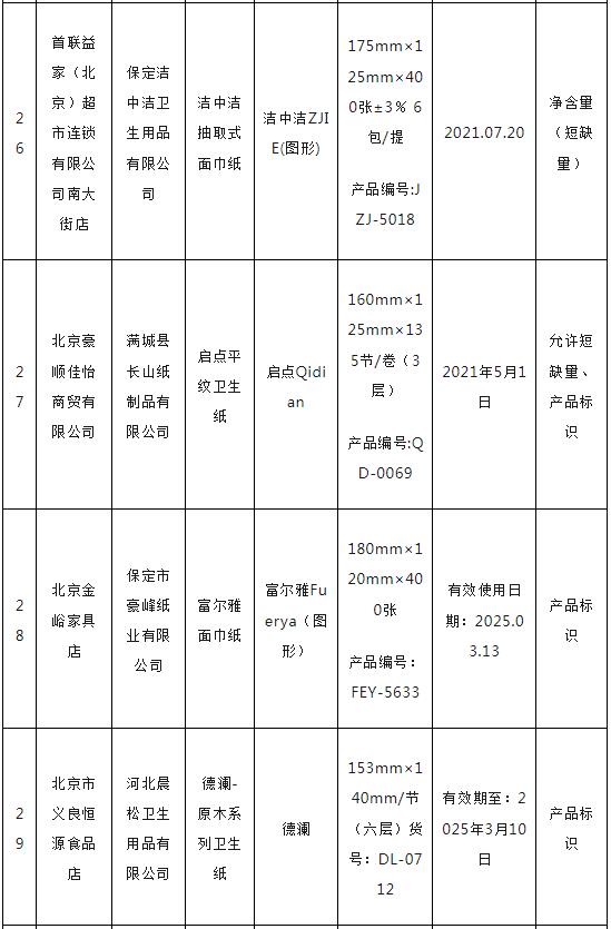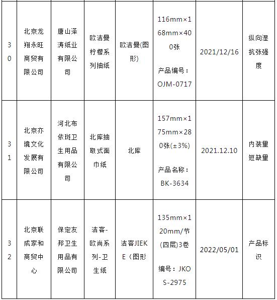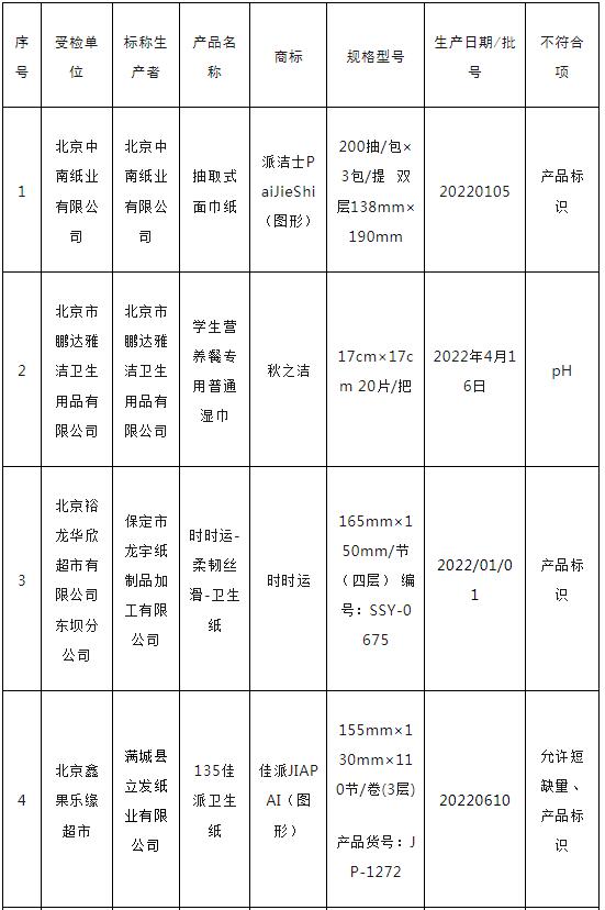 2023年7月27日,北京市市場(chǎng)監(jiān)督管理局網(wǎng)站發(fā)布北京市紙及紙制品產(chǎn)品質(zhì)量監(jiān)督抽查結(jié)果公示。 按照《中華人民共和國(guó)產(chǎn)品質(zhì)量法》《產(chǎn)品質(zhì)量監(jiān)督抽查管理暫行辦法》等法律、規(guī)章,以及北京市產(chǎn)品質(zhì)量監(jiān)督抽查計(jì)劃和實(shí)施細(xì)則,北京市市場(chǎng)監(jiān)督管理局組織開(kāi)展了紙及紙制品產(chǎn)品質(zhì)量監(jiān)督抽查。共抽樣檢驗(yàn)93組批樣品,檢出32組批樣品不符合相關(guān)標(biāo)準(zhǔn),檢驗(yàn)結(jié)果不合格。 對(duì)于抽查發(fā)現(xiàn)的不合格產(chǎn)品生產(chǎn)者、銷售者,北京市市場(chǎng)監(jiān)督管理局已全部移交經(jīng)營(yíng)主體所在地市場(chǎng)監(jiān)管部門依法進(jìn)行處理。北京市市場(chǎng)監(jiān)督管理局建議消費(fèi)者購(gòu)買紙及紙制品產(chǎn)品時(shí),注意查看產(chǎn)品或者其包裝上標(biāo)注的產(chǎn)品信息與實(shí)物信息是否一致,選擇包裝信息完整的產(chǎn)品;不選購(gòu)內(nèi)裝量短缺量、縱向濕抗張強(qiáng)度、pH、滲透性能項(xiàng)目不符合標(biāo)準(zhǔn)的產(chǎn)品,以免侵害消費(fèi)者的利益和影響消費(fèi)者使用。 不合格產(chǎn)品信息