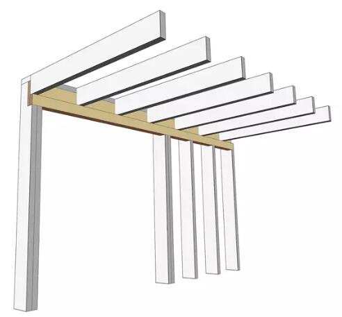 注釋:對于落地窗,房間高度和窗戶高度之間的微小差異為過梁提供的空間極其有限。十厘米長的窗過梁采用Kerto LVL制作可節省材料和空間。