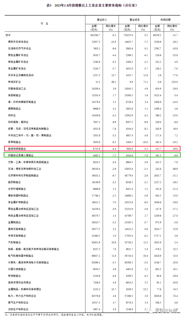 在41個(gè)工業(yè)大類行業(yè)中,造紙和紙制品業(yè)在1-8月份實(shí)現(xiàn)利潤總額151.7億元,同比下降39.8%;印刷和記錄媒介復(fù)制業(yè)在1-8月份實(shí)現(xiàn)利潤總額191.5億元,同比下降9.6%。利潤降幅較1-7月份均有所收窄。 在營業(yè)收入方面,1-8月份,規(guī)模以上工業(yè)企業(yè)實(shí)現(xiàn)營業(yè)收入84.33萬億元,同比下降0.3%。其中,造紙和紙制品業(yè)實(shí)現(xiàn)營業(yè)收入8715.9億元,同比下降4.4%;印刷和記錄媒介復(fù)制業(yè)實(shí)現(xiàn)營業(yè)收入4092.5億元,同比下降7.2%。