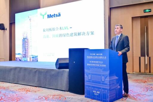 尊敬的劉會(huì)長(zhǎng)、各位領(lǐng)導(dǎo)、各位朋友, 大家下午好!我是芬林集團(tuán)的宋望球,今天代表這家芬蘭森工企業(yè), 為大家介紹一下我們集團(tuán)主要生產(chǎn)的木結(jié)構(gòu)建筑材料——旋切板膠合木LVL的應(yīng)用和我們公司的生產(chǎn)和供應(yīng)情況。 剛才兩位演講嘉賓為大家呈現(xiàn)了木結(jié)構(gòu)的綠色低碳實(shí)用案例。我將從木建筑材料的角度,著重介紹一下結(jié)構(gòu)和裝飾性的木建筑材料LVL,也就是我們林業(yè)上所說的單板層積材,建筑行業(yè)稱之為旋切板膠合木。芬林集團(tuán)是歐洲的一家森工企業(yè),總部在芬蘭赫爾辛基。集團(tuán)業(yè)務(wù)橫跨森林管理到木材供應(yīng),擁有木材加工、制漿、造紙業(yè)務(wù),是一家全產(chǎn)業(yè)鏈企業(yè),年?duì)I業(yè)額約70億歐元。中國(guó)是我們非常重要的市場(chǎng),去年芬林在中國(guó)的營(yíng)業(yè)額約為十億歐元,最主要的產(chǎn)品是紙漿和鋸材。另外,還供應(yīng)深加工木制品、包裝紙板和防油紙等產(chǎn)品。在旋切板膠合木領(lǐng)域,中國(guó)市場(chǎng)還是處于比較早的起步階段。芬林亞太區(qū)的LVL主要市場(chǎng)在澳大利亞。芬林梅沙木業(yè)作為集團(tuán)五個(gè)事業(yè)部之一,它所供應(yīng)的產(chǎn)品主要包括了今天要著重介紹的旋切板膠合木——被廣泛應(yīng)用于各類的建筑行業(yè),同時(shí),云杉膠合板也是我們的一個(gè)主打產(chǎn)品。另外還有樺木膠合板和一些高端的鋸材產(chǎn)品。 談到木結(jié)構(gòu)建筑的未來趨勢(shì),對(duì)作為材料供應(yīng)商來講,我們認(rèn)為未來市場(chǎng)前景是非常光明和可期的。城市化帶來的市場(chǎng)需求,可持續(xù)發(fā)展也為建筑行業(yè)帶來非常長(zhǎng)遠(yuǎn)的影響。建筑的綠色發(fā)展所涉及到的核心問題,是整個(gè)建筑行業(yè)的二氧化碳排放、或者說溫室氣體的排放,占整個(gè)經(jīng)濟(jì)活動(dòng)中總排放的比重非常高。全球來講,約30%的溫室氣體排放是由建筑行業(yè)“貢獻(xiàn)”的。所以綠色建筑也成為各國(guó)碳中和政策和氣候治理領(lǐng)域的核心內(nèi)容之一。 在歐盟,綠色建筑是非常核心的政策制定關(guān)注點(diǎn)之一。歐盟制定了2050年實(shí)現(xiàn)碳中和目標(biāo),公布了一個(gè)“Fit For 55”的總規(guī)劃。在這個(gè)規(guī)劃里邊就涉及到能源轉(zhuǎn)型、交通、建筑行業(yè)等領(lǐng)域,制定了非常具體的行業(yè)發(fā)展目標(biāo)。芬蘭作為歐盟成員國(guó),芬蘭議會(huì)在2023年春天也通過了一項(xiàng)具體建筑法案的更新,明確規(guī)定了新建建筑從建筑階段到生命周期結(jié)束的碳排放總量。將來會(huì)以立法的形式強(qiáng)制建筑行業(yè)進(jìn)行低碳轉(zhuǎn)型,這將助力芬蘭在2035年實(shí)現(xiàn)碳中和的國(guó)家目標(biāo)。 剛才也聽到了幾位專家介紹,建筑材料隱含的碳排放是非常巨大的,無論是混凝土、鋼結(jié)構(gòu)的材料,還是一些裝飾材料,包括隔熱材料等等……在它們的制造過程中,會(huì)產(chǎn)生相當(dāng)大量的二氧化碳排放。木材作為一種可再生原材料,它是唯一一種可以固碳的建筑材料。每立方米的木材在它的生命周期中,不同樹種的吸碳量達(dá)到700-1000公斤的水平。所以木材是非常好的實(shí)現(xiàn)綠色建筑的材料。而且木結(jié)構(gòu)的建筑通過它的輕量、預(yù)制等特點(diǎn),可以幫助減少建筑過程中的碳排放。 那我們來看一下LVL旋切板膠合木的一個(gè)應(yīng)用情況。芬林梅沙木業(yè)是一個(gè)擁有40多年歷史的LVL供應(yīng)商,積累了不少寶貴經(jīng)驗(yàn)。運(yùn)用這樣的一類建筑材料,可以節(jié)約建筑時(shí)間,提高現(xiàn)場(chǎng)工作效率。LVL可以預(yù)制大構(gòu)件。材料主要使用北歐的云杉樹種,通過旋切技術(shù)旋切成三毫米左右的厚木片,再進(jìn)行膠合,根據(jù)客戶的需求形成各種規(guī)格的建材。該產(chǎn)品很大程度上可以預(yù)制,而且可以根據(jù)每個(gè)建筑設(shè)計(jì)的要求來定制它的規(guī)格。芬林梅沙木業(yè)是歐洲最大的LVL建筑材料的供應(yīng)商,現(xiàn)有每年的供應(yīng)能力是30萬立方米。產(chǎn)品主要面向歐洲市場(chǎng),在澳洲和北美市場(chǎng)也有我們長(zhǎng)期的應(yīng)用客戶。LVL產(chǎn)品的生產(chǎn)過程已實(shí)現(xiàn)百分之百使用生物質(zhì)能源,整個(gè)建筑材料本身是非常綠色的。 接下來為大家通過圖片的形式展示一下,芬林梅沙木業(yè)生產(chǎn)的膠合板旋切木在各類建筑領(lǐng)域當(dāng)中的實(shí)際應(yīng)用情況。這里包括結(jié)構(gòu)材、裝飾材還有一些預(yù)制的應(yīng)用。我們有自己的LVL品牌,注冊(cè)商標(biāo)Kerto? 。