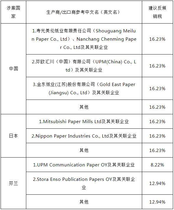 2023年12月21日,韓國貿易委員會發(fā)布第2023-18號公告(案件號23-2023-2),對原產于中國、日本和芬蘭的每平米重量介于55克~110克之間的涂布印刷紙(CoatedPrintingPaper)作出反傾銷第一次日落復審肯定性終裁,建議韓國企劃財政部繼續(xù)對涉案產品征收為期五年反傾銷稅,其中,中國和日本涉案產品的稅率均為16.23%、芬蘭稅率為8.22%和12.94%,稅率詳見附表。涉案產品的韓國稅號為4810.13.1000、4810.14.1000、4810.19.1000、4810.19.9000、4810.22.0000和4810.29.0000。 2017年7月10日,韓國對原產于中國、日本和芬蘭的每平米重量介于55克~110克之間的涂布印刷紙進行反傾銷調查。依據韓國企劃財政部第684號令,韓國決定自2018年7月22日起對中國、日本和芬蘭的涂布印刷紙征收反傾銷稅,措施有效期至2023年7月21日。2023年3月21日,韓國對該案啟動第一次日落復審調查。 附表:韓國對涉華涂布印刷紙反傾銷案第一次日落復審終裁建議征稅表