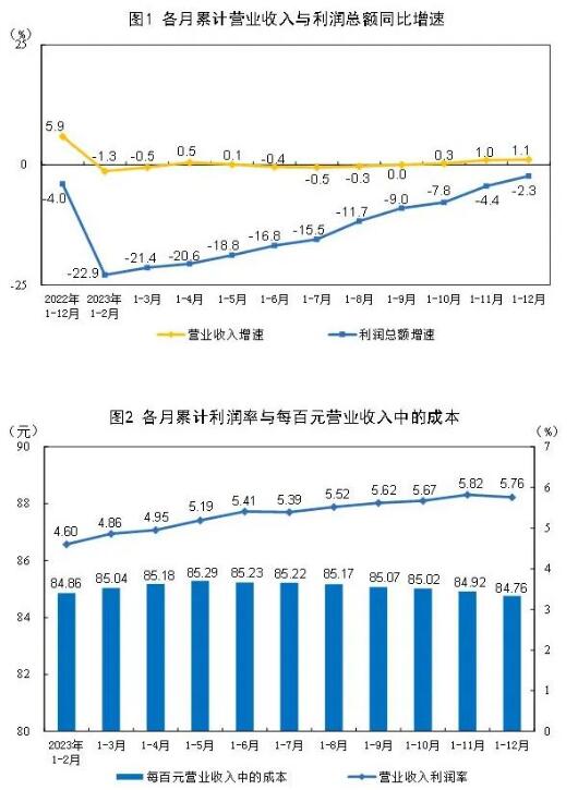 2023年,規(guī)模以上工業(yè)企業(yè)實(shí)現(xiàn)營(yíng)業(yè)收入133.44萬(wàn)億元,比上年增長(zhǎng)1.1%;發(fā)生營(yíng)業(yè)成本113.10萬(wàn)億元,增長(zhǎng)1.2%;營(yíng)業(yè)收入利潤(rùn)率為5.76%,比上年下降0.20個(gè)百分點(diǎn)。其中,造紙和紙制品業(yè)實(shí)現(xiàn)營(yíng)業(yè)收入13926.2億元,同比下降2.4%;印刷和記錄媒介復(fù)制業(yè)實(shí)現(xiàn)營(yíng)業(yè)收入6576.9億元,同比下降4.7%。 2023年末,規(guī)模以上工業(yè)企業(yè)資產(chǎn)總計(jì)167.36萬(wàn)億元,比上年增長(zhǎng)6.0%;負(fù)債合計(jì)95.57萬(wàn)億元,增長(zhǎng)5.9%;所有者權(quán)益合計(jì)71.79萬(wàn)億元,增長(zhǎng)6.2%;資產(chǎn)負(fù)債率為57.1%,比上年下降0.1個(gè)百分點(diǎn)。 2023年末,規(guī)模以上工業(yè)企業(yè)應(yīng)收賬款23.72萬(wàn)億元,比上年增長(zhǎng)7.6%;產(chǎn)成品存貨6.14萬(wàn)億元,增長(zhǎng)2.1%。 2023年,規(guī)模以上工業(yè)企業(yè)每百元營(yíng)業(yè)收入中的成本為84.76元,比上年增加0.04元;每百元營(yíng)業(yè)收入中的費(fèi)用為8.56元,比上年增加0.20元。 2023年末,規(guī)模以上工業(yè)企業(yè)每百元資產(chǎn)實(shí)現(xiàn)的營(yíng)業(yè)收入為82.4元,比上年減少4.9元;人均營(yíng)業(yè)收入為181.5萬(wàn)元,比上年增加5.9萬(wàn)元;產(chǎn)成品存貨周轉(zhuǎn)天數(shù)為19.3天,比上年增加0.9天;應(yīng)收賬款平均回收期為60.6天,比上年增加4.4天。 12月份,規(guī)模以上工業(yè)企業(yè)實(shí)現(xiàn)利潤(rùn)同比增長(zhǎng)16.8%。 國(guó)家統(tǒng)計(jì)局工業(yè)司統(tǒng)計(jì)師于衛(wèi)寧解讀工業(yè)企業(yè)利潤(rùn)數(shù)據(jù)表示,2023年,國(guó)內(nèi)需求逐步改善,工業(yè)生產(chǎn)穩(wěn)步回升,規(guī)模以上工業(yè)企業(yè)效益持續(xù)恢復(fù),主要行業(yè)利潤(rùn)積極改善,新動(dòng)能培育壯大,工業(yè)經(jīng)濟(jì)高質(zhì)量發(fā)展基礎(chǔ)進(jìn)一步鞏固。超六成行業(yè)全年利潤(rùn)實(shí)現(xiàn)增長(zhǎng),七成行業(yè)利潤(rùn)呈回升態(tài)勢(shì)。2023年,在41個(gè)工業(yè)大類行業(yè)中,有27個(gè)行業(yè)利潤(rùn)比上年增長(zhǎng),利潤(rùn)增長(zhǎng)面為65.9%,比上年擴(kuò)大12.2個(gè)百分點(diǎn);有29個(gè)行業(yè)全年利潤(rùn)增速比1—11月份加快或降幅收窄、由降轉(zhuǎn)增,呈回升態(tài)勢(shì),占70.7%。
