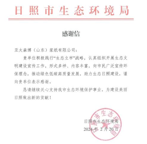 2月20日,日照市生態(tài)環(huán)境局向公司發(fā)來感謝信,對公司積極踐行“生態(tài)立市”戰(zhàn)略、認真組織生態(tài)文明建設(shè)宣傳工作、向市民廣泛宣傳環(huán)保理念、推動城市綠色低碳高質(zhì)量發(fā)展、助力生態(tài)日照建設(shè)等方面的貢獻表示感謝。