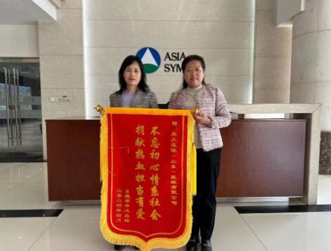 “衷心感謝亞太森博對日照市無償獻血工作的大力支持和幫助,特贈送錦旗,表示感謝。”4月10日,日照市中心血站代表將繡著“不忘初心情系社會捐獻熱血擔當有愛”的錦旗送到了公司工會主席高蕾的手中,以表彰公司在無償獻血活動中所展現出的積極參與和突出貢獻。