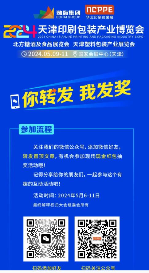 中國(天津)印刷包裝產業博覽會 2024年5月09日-11日 國家會展中心(天津) 期待您的加入! 2024中國(天津)印刷包裝產業博覽會(簡稱:NCPPE華北包裝展)將于2024年5月9-11日,國家會展中心(天津)盛大召開!同期舉辦:天津印刷包裝展、天津塑料產業展、天津金屬包裝展、北方糖酒及食品展,四展聯動、設立4000個標準展位、預計1000家企業集中亮相。 展會由天津市包裝技術協會主辦,渤海集團(天津)國際展覽有限公司承辦。我們將圍繞工業4.0與打造展示,體驗,交流,交易四個平臺,集中展示印刷包裝行業新材料,新設備,新技術,新工藝,新產品,打造專業觀眾開闊思路,社會觀眾增強的體驗平臺。融印刷原理學習,印刷流程參與,印刷包裝產品制作為一體;打造發展動態,推動深化改革的交流平臺,打通政產研學通道,為印刷包裝企業提供創新發展的新理念,新思路,新模式,新樣板,解決行業發展痛點,打造供需對接,宣傳賣買交易平臺,為包裝印刷產品找市場,為印刷包裝市場推介優秀產品和服務。 本屆展會以“紙包裝、塑料包裝、金屬包裝、糖酒食品”四大領域為主題,構建包裝全產業鏈。必將是一次高層次、大規模、影響深遠隆重的盛會。在此我們誠摯邀請國內外包裝印刷行業仁人志士,參與2024華北印刷包裝展的建設。我們將以飽滿熱情和周到的服務迎接您的到來!