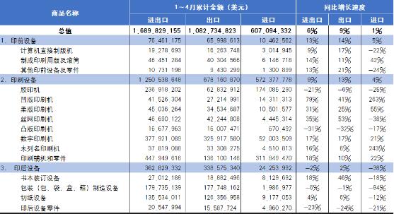 同期,印刷裝備主要出口品種變化:計算機直接制版機472臺、1626.37萬美元(同比增長17%);膠印機850臺、6283.29萬美元(同比下降6%);凹版印刷機467臺、2127.50萬美元(同比增長41%);柔版印刷機498臺、3453.47萬美元(同比增長25%);絲網印刷機3.15萬臺、4224.48萬美元(同比增長53%);凸版印刷機1682臺、1600.75萬美元(同比下降32%);數字印刷機42.81萬臺、3.26億美元(同比增長17%);印刷輔機和零件1.36億美元(同比增長10%);書本裝訂設備1888.25萬美元(同比增長46%);包裝制造設備1.78億美元(同比下降1%);切紙設備1.26億美元(同比增長6%)。 另外,本期出口膠印機中,卷筒膠印機503臺、521.36萬美元;單色平張紙膠印機54臺、176.89萬美元;雙色平張紙膠印機125臺、466.90萬美元;四色平張紙膠印機81臺、1164.52萬美元;五色及以上平張紙膠印機86臺、2668.54萬美元。 2024年1~4月國內印刷裝備進口6.07億美元(參見表3),與去年同期相比增長1%。其中,印前設備進口1046.20萬美元(同比增長5%)、印刷設備進口5.72億美元(同比增長4%)、印后設備進口2425.40萬美元(同比下降38%)。 同期,印刷裝備主要進口品種變化情況:計算機直接制版機43臺、301.49萬美元(同比下降22%);膠印機298臺、1.74億美元(同比下降25%);凹版印刷機8臺、1431.13萬美元(同比增長263%);柔版印刷機5臺、1050.16萬美元(同比增長55%);絲網印刷機59臺、444.53萬美元(同比下降38%);數字印刷機4.80萬臺、5200.35萬美元(同比增長21%);印刷輔機和零件3.12億美元(同比增長22%);書本裝訂設備812.97萬美元(同比下降18%);包裝制造設備198.70萬美元(同比下降84%);切紙設備917.71萬美元(同比下降12%)。 另外,本期進口膠印機中,卷筒膠印機8臺、299.78萬美元;單色平張紙膠印機22臺、13.68萬美元;雙色平張紙膠印機24臺、165.61萬美元;四色平張紙膠印機49臺、1976.82萬美元;五色及以上平張紙膠印機194臺、1.48億美元。 國內印刷器材出口和進口基本情況 2024年1~4月國內印刷器材出口4.08億美元(參見表4),與去年同期相比增長9%。其中,印刷油墨及墨水出口1.56億美元(同比增長14%),印刷版材2.53億美元(同比增長6%)。 表42024年1~4月國內印刷器材進出口總值表