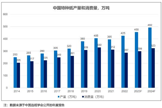 特種紙 特種紙種類繁多、用途廣泛,比如日常生活中常見的食品包裝紙、無碳復寫紙、熱敏紙、醫(yī)療包裝紙、防偽紙等都屬于特種紙。而不同用途的特種紙,其成紙關鍵指標和性能要求均不盡相同。 亞太森博BPSP漿 隨著社會的不斷發(fā)展和人民生活水平的提高,人們對于特種紙需求量不斷增加。劉工直播中講解道,中國當前特種紙發(fā)展較為迅速,根據(jù)相關數(shù)據(jù)顯示,從2014年到2023年,中國特種紙產(chǎn)能增加了80%左右,特種紙消費量增加了45%左右。與2023年相比,2024年我國特種紙產(chǎn)量和消費量預計將增長約8%。