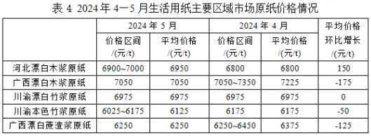 2024年5月,河北漂白木漿原紙價格仍保持上漲,廣西地區(qū)漂白木漿原紙和漂白蔗渣漿原紙價格均有下降,且降幅較大,分別為175元/t和125元/t。川渝地區(qū)漂白竹漿原紙價格保持穩(wěn)定,本色竹漿原紙價格下降。 具體來看,木漿原紙中,河北漂白木漿原紙平均價格約6950元/t,上漲150元/t。廣西漂白木漿原紙平均價格約7050元/t,下降175元/t。 非木漿原紙中,川渝漂白竹漿原紙平均價格約6975元/t,與2024年4月持平。川渝本色竹漿原紙平均價格約6125元/t,較2024年4月下降50元/t。廣西漂白蔗渣漿原紙平均價格約6250元/t,較2024年4月下降125元/t。 具體變化情況見表4。