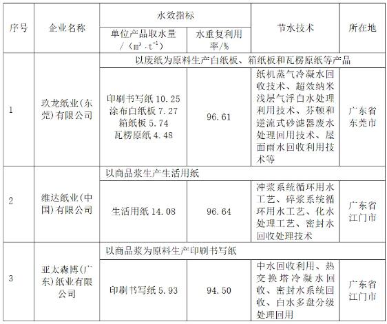 六、節能節水及綠色制造 2023年2月,工業和信息化部、水利部、國家發改委、國家市場監督管理總局聯合發布2022年重點用水企業、園區水效領跑者名單(四部門公告2023年第4號),遴選出74家具備引領示范和典型帶動效應的水效領跑者企業和園區,共有12家造紙企業入選水效領跑者企業名單,其中廣東省有3家企業入選,分別是:玖龍紙業(東莞)有限公司、維達紙業(中國)有限公司、亞太森博(廣東)有限公司,具體情況見表2。 表22022年重點用水企業、園區水效領跑者名單(節選廣東造紙企業)