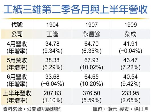 臺灣造紙三雄營運(yùn)穩(wěn)健 據(jù)了解,相較去年,工紙市況在今年逐步好轉(zhuǎn),第二季的整體需求又優(yōu)于首季。大陸工紙需求、價格亦持續(xù)改善,造紙三雄進(jìn)入第二季后業(yè)績有更明顯改善。 榮成紙業(yè):自結(jié)6月營收40.54億元、年增9.42%;上半年營收233.95億元、年增2.65%,稅前凈利歸屬母公司業(yè)主1.55億元。 正隆紙業(yè):6月營收33.68億元、年減6.04%,上半年營收207.83億元、年增1.1%。 永豐余:6月營收64.65億元、年增10.2%,上半年營收376.5億元、年增5.59%。 尤其是6月大陸市場在下游紙箱廠補(bǔ)庫存拉貨動能提振下,工紙廠的出貨狀況整體優(yōu)于市場預(yù)期,庫存有效降低,亦帶動在大陸有工紙產(chǎn)能布局的榮成、永豐余6月營運(yùn)有較大增長。 此外,永豐余也受益于多角化經(jīng)營推動,其主要事業(yè)體6月營收多有成長,其旗下的華紙6月營收17.25億元、年增7.27%,上半年營收106.89億元、年增1.64%。 樂觀看待下半年市場 對于下半年工紙市況,正隆紙業(yè)看好傳統(tǒng)旺季到來疊加去塑意識持續(xù)擴(kuò)大紙包裝需求,樂觀認(rèn)為整體營收將穩(wěn)健成長。 永豐余指出,將持續(xù)垂直整合大陸工紙與紙器資源,將規(guī)模效益釋放,看好下半年大陸工紙價格會陸續(xù)回穩(wěn),商品需求也會回暖。 相關(guān)法人表示,下半年將陸續(xù)有中秋、大陸十一長假、雙11電商節(jié)、圣誕節(jié)等檔期助推工紙市場,看好工紙產(chǎn)能與需求將逐季暢旺,下游有望擴(kuò)大補(bǔ)庫存,使整體供需趨于平衡。 臺灣工紙三雄先在上半年維持住穩(wěn)健業(yè)績與增長,預(yù)計下半年工紙價格回穩(wěn)、庫存狀況改善后,工紙景氣與企業(yè)營運(yùn)有望再有更大反彈。 注:文中所有貨幣均為新臺幣