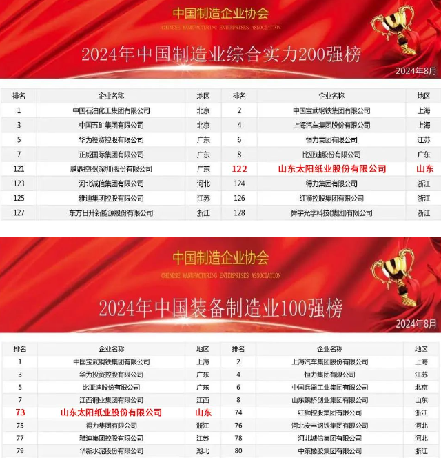 近日,中國制造企業協會對外發布《2024中國制造業綜合實力200強暨中國裝備制造業百強》榜單。其中,太陽紙業憑借出眾的創新能力和出色的業績表現,再次入圍2024中國制造業綜合實力200強榜單,位列第122位,較去年上升12個位次;并同時入圍2024中國裝備制造業百強榜單,位列第73位。 據悉,此次榜單的發布是中國制造企業協會對我國制造業企業進行全面、科學、獨立調查研究的成果。經過對超過8000家中國大陸制造型企業的數據采集與深入分析,嚴格按照營業收入、資產總額、利潤總額、所有者權益、研發投入、從業人數等多維度指標進行綜合評分,并邀請百位企業高管、學者及官員參與評選,同時對部分候選企業進行實地拜訪,確保了榜單的權威性與公正性。 2024年是太陽紙業聚焦培育和發展新質生產力的突破之年。下一步,公司將牢牢把握綠色低碳高質量發展首要任務,堅持穩中求進、以進促穩,在科技創新突破上展現太陽作為,在造紙產業轉型升級上發揮太陽優勢,在踐行ESG發展理念上體現太陽擔當,行穩致遠打造可持續發展、受人尊重的全球卓越企業,全力開創公司高質量可持續發展新局面!