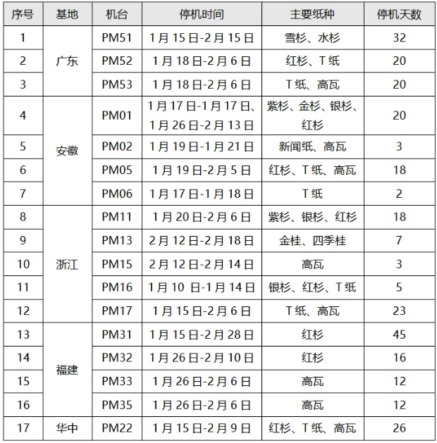 近期,廣東省造紙行業協會根據各企業公告和媒體報導的信息進行收集整理,匯總了截至2025年1月10日部分造紙企業公布的2024年春節停機檢修情況。詳見下表,信息僅供參考。