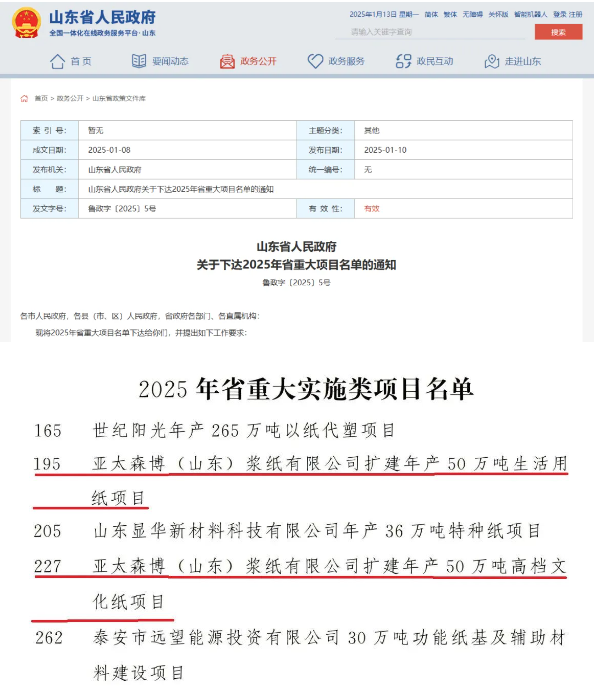 2025年是“十四五”規劃的收官之年,也是謀劃“十五五”的關鍵之年,山東大力推進重大產業項目和重點項目建設。亞太森博(山東)漿紙有限公司2個項目入圍省政府發布的2025年省重大項目名單。