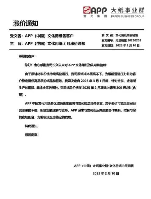 APP(中國)事業(yè)群·文化用紙內(nèi)貿(mào)銷售:由于原輔材料價格持續(xù)高位運行,我司原紙成本居高不下,為緩解營運壓力并為客戶穩(wěn)定提供高品質(zhì)的紙品和服務(wù),我司決定自2025年3月1日起,針對金東、金海所生產(chǎn)的銅版、非涂全系各紙種、克重紙品價格在 2025年2月基礎(chǔ)上調(diào)漲200 元/噸(含稅)。