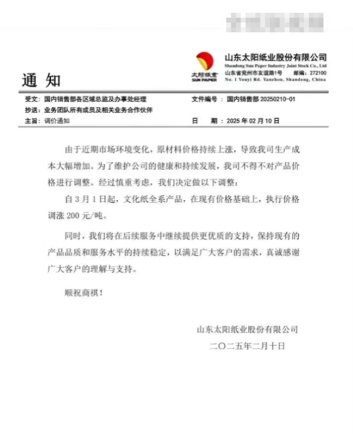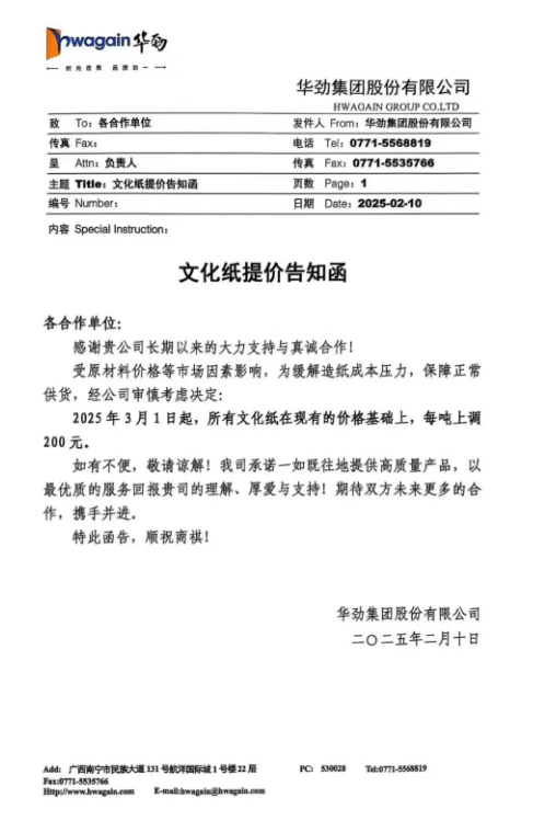 華勁集團:受原材料價格等市場因素影響,為緩解造紙成本壓力,保障正常供貨,經(jīng)公司審慎考慮決定:2025年3月1日起,所有文化紙在現(xiàn)有的價格基礎(chǔ)上,每噸上調(diào)200元。