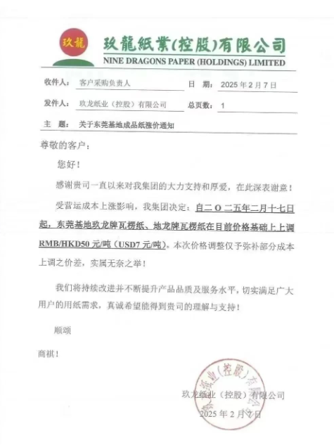 玖龍紙業(yè)宣布旗下基地繼續(xù)漲價,東莞基地自2月17日起,玖龍牌瓦楞紙、地龍牌瓦楞紙在目前價格基礎(chǔ)上上調(diào)RMB/HKD50元/噸(USD7元/噸)。