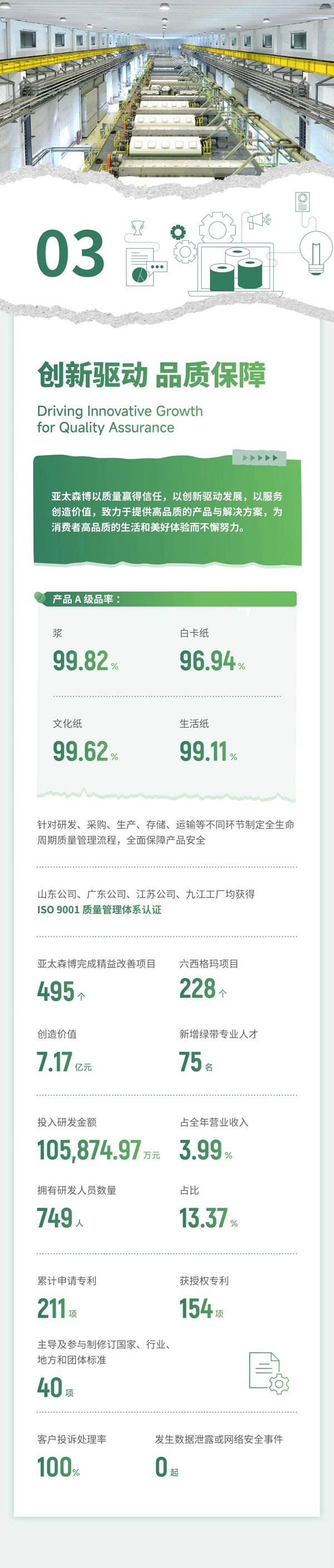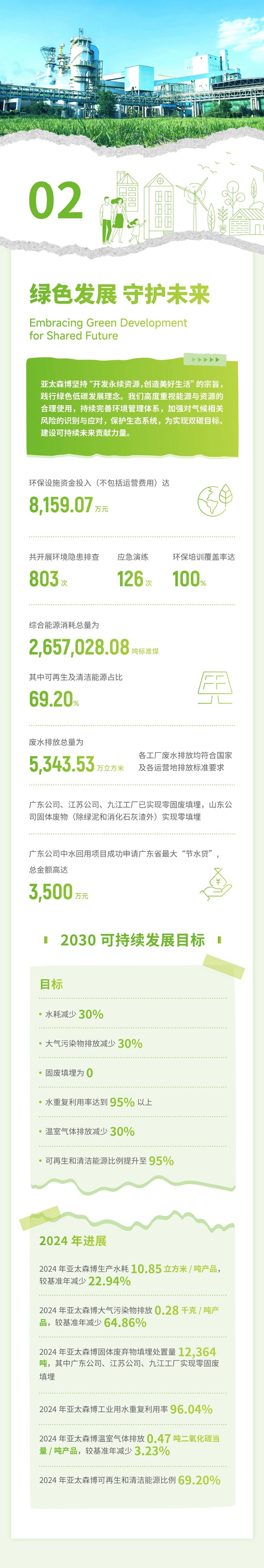 報告通過“誠信經營穩健前行”“綠色發展守護未來”“創新驅動品質保障”“關愛員工以人為本”“協同發展和諧前行”等章節,用詳實的數據和案例全面展示了亞太森博2024年度可持續發展績效,系統回應了各利益相關方關注的實質性議題,表達了亞太森博愿與所有利益相關方攜手共進,共同書寫美好未來的信心和決心。