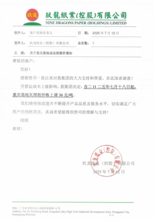 7.18起玖龍重慶基地瓦楞紙同步上調紙價