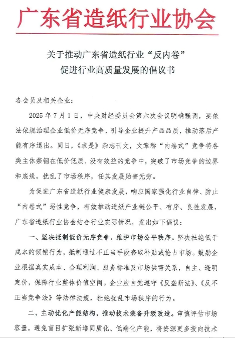 全文如下: 關于推動廣東省造紙行業“反內卷” 促進行業高質量發展的倡議書 各會員及相關企業: 2025年7月1日,中央財經委員會第六次會議明確強調,要依法依規治理企業低價無序競爭,引導企業提升產品品質,推動落后產能有序退出。同日,《求是》雜志刊文,文章稱“內卷式”競爭將各類主體禁錮在低價低質、沒有效益的競爭中,突破了市場競爭的邊界和底線,擾亂了市場秩序,任其發展貽害無窮。 為促進廣東省造紙行業健康發展,響應國家強化行業自律、防止“內卷式”惡性競爭,有效推動造紙產業鏈公平、有序、良性發展,廣東省造紙行業協會結合行業實際情況,發出如下倡議: 一、堅決抵制低價無序競爭,維護市場公平秩序。堅決杜絕低于成本的傾銷行為,抵制通過不正當手段套取補貼或搶占市場。鼓勵企業根據真實成本、合理利潤、服務標準及市場供需關系,自主、透明定價,保障行業整體價值空間。企業應自覺遵守《反壟斷法》、《反不正當競爭法》等法律法規,杜絕擾亂市場秩序的行為。 二、主動優化產能結構,推動技術裝備升級改造。審慎評估市場容量,避免盲目擴張新增同質化、低端化產能,將資源更多投向技術改造與升級,加快替換高能耗、低效率的老舊設備,采用自動化、數字化生產技術提升效率,積極申報“兩新”政策技改資金補貼,合理利用國家補貼對現有生產線實施技術改造。 三、強化質量引領與創新驅動,實現價值競爭轉型。將競爭重心從“拼價格”轉向“拼質量、拼服務、拼創新”,通過工藝改進、管理優化持續提升產品性能和穩定性,開發高附加值產品。積極參與標準建設工作,通過高標準引領行業高質量發展,減少低水平同質化競爭。 四、構建行業自律協同機制,共建良好生態。倡導企業誠信經營,共同抵制破壞行業生態的惡性競爭行為,維護健康的上下游合作關系,倡導公平交易,如合理縮短賬期、杜絕惡意拖欠貨款、反對壓價等行為,保障產業鏈各環節合理利益。加強行業信息的交流共享,引導企業做出理性決策。 讓我們積極踐行上述倡議,以堅定的決心和實際行動共同抵制“內卷式”惡性競爭!我們堅信,通過全行業的共同努力,抵制低價競爭,推動轉型升級,激發創新活力,強化自律協同,定能營造一個公平有序、健康可持續的市場環境,推動廣東省造紙行業邁向更高水平的發展新階段! 廣東省造紙行業協會 二〇二五年七月二十四日