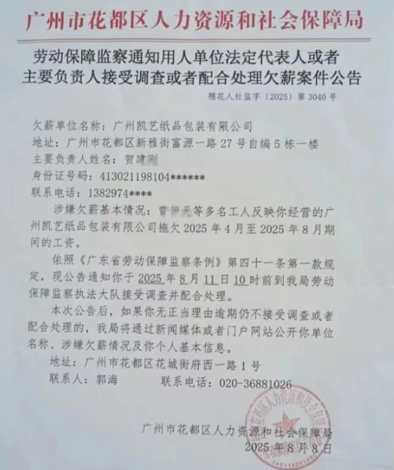 然而,面對成本不斷攀升、業(yè)務(wù)持續(xù)下滑等多重壓力,廣州凱藝紙品的資金問題逐漸浮出水面。在廣州市花都區(qū)人力資源和社會保障局于8月8日發(fā)布的一份公告顯示,該公司因拖欠2025年4月至2025年8月期間的工資,被要求接受調(diào)查并配合處理。