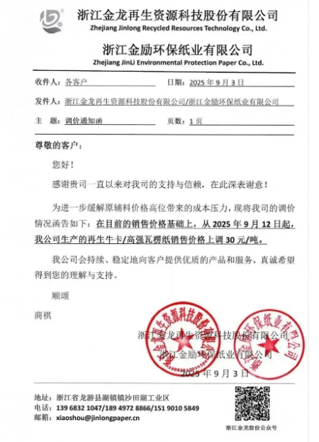 在目前的銷售價格基礎上,從2025年9月12日起,我公司生產的再生牛卡/高強瓦楞紙銷售價格上調30元/噸。