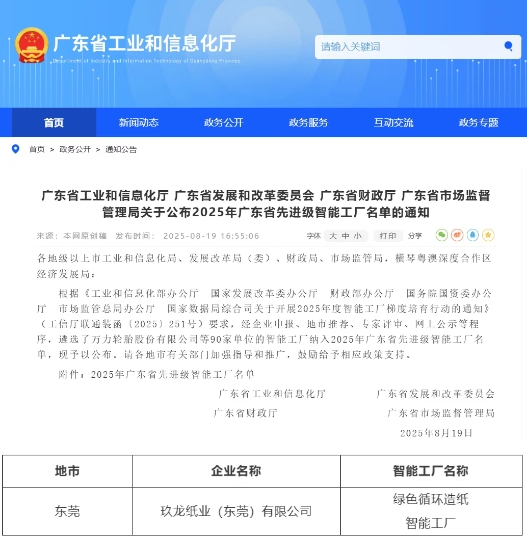 近日,廣東省工業和信息化廳公布《2025年先進級智能工廠名單》,共有90家單位入選,其中,廣東省造紙行業協會副會長單位玖龍紙業(東莞)有限公司光榮上榜!