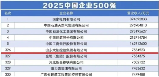 9月15日,中國(guó)企業(yè)聯(lián)合會(huì)、中國(guó)企業(yè)家協(xié)會(huì)在京召開(kāi)新聞發(fā)布會(huì),發(fā)布“2025中國(guó)企業(yè)500強(qiáng)”榜單。其中,公司控股股東山東太陽(yáng)控股集團(tuán)有限公司憑借穩(wěn)健的經(jīng)營(yíng)表現(xiàn)和卓越的綜合實(shí)力榮耀登榜,位列第326位,較去年提升10位!