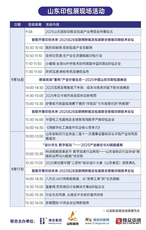 箱匯齊魯,印創(chuàng)未來!9月16日,2025海名·山東印刷及包裝產(chǎn)業(yè)博覽會(huì)(以下簡(jiǎn)稱“山東印包展”)在山東國(guó)際會(huì)展中心2號(hào)館隆重開幕。本屆匯聚參展企業(yè)200+家,展示新產(chǎn)品新技術(shù)1000余個(gè),展覽面積10000+平方米。覆蓋印刷包裝完整的上下游產(chǎn)業(yè)鏈,涵蓋印刷設(shè)備、瓦楞紙箱機(jī)械、標(biāo)識(shí)標(biāo)簽、智能包裝機(jī)械、包裝制品及材料、圖文印務(wù)等全新題材。