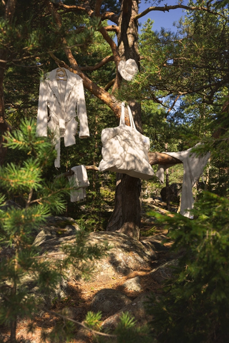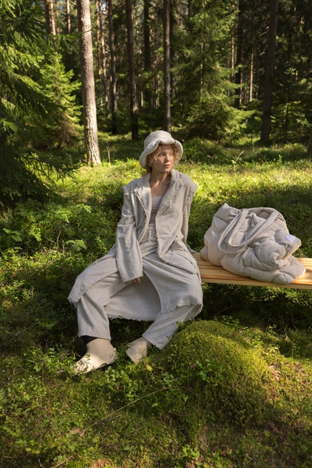 維爾塔寧表示:“木材的氣味和質感與桑拿體驗密切相關,因此使用木質纖維來設計桑拿專用服飾是非常自然的選擇。通過這個系列,我希望強調服飾和紡織品在快節奏生活中幫助人們放松的重要作用。” Kuura既可用作服飾面料,也可作填充材料。在面料成分中,Kuura占比30%,棉花占比70%。該服飾的設計靈感源自自然形態:縫線圖案基于艾內科斯基的地形,邊緣流蘇則模仿胡須地衣的形態。 “我希望打造多功能服飾,例如桑拿包可作為枕頭或坐墊使用,裙子可展開作為毛巾,夾克既可作浴袍,也適合外出穿搭。” 維爾塔寧補充道。
