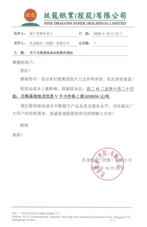 • 玖龍沈陽基地 自十月二十三日起,沈陽基地地龍牛卡、再生牛卡、瓦楞紙價格上調30元/噸。