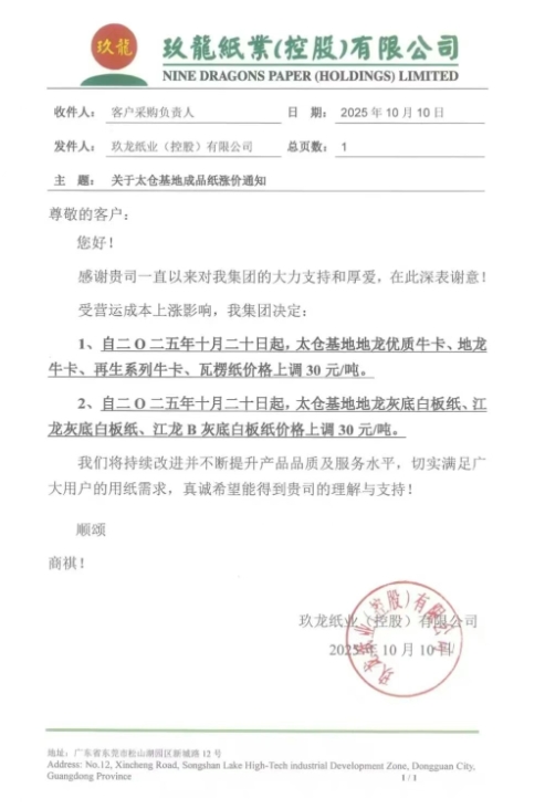 • 玖龍太倉基地 1、自十月二十日起,太倉基地地龍優質牛卡、地龍牛卡、再生系列牛卡、瓦楞紙價格上調30元/噸。 2、自十月二十日起,太倉基地地龍灰底白板紙、江龍灰底白板紙、江龍B灰底白板紙價格上調30元/噸。