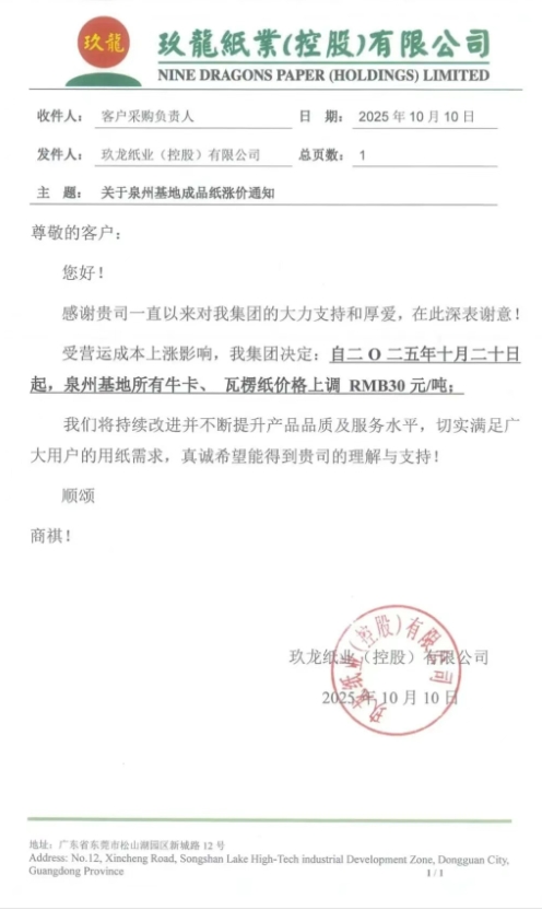 • 玖龍泉州基地 自十月二十日起,泉州基地所有牛卡、瓦楞紙價格上調RMB30元/噸。