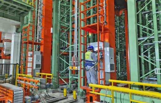 ▲工作人員正在調(diào)試堆垛機 亞太森博50萬噸文化紙自動化立體倉庫項目建筑面積1.3萬平方米,建筑高度38米,采用全自動存取倉儲系統(tǒng),安裝14臺堆垛機及配套貨架,主要用于文化紙和紙板的倉儲。項目于2024年10月份開工建設(shè),目前,土建施工已結(jié)束,設(shè)備安裝工作基本完成,正在進(jìn)行收尾工作。