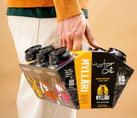 奧露畝 (Olutmylly) 是一家位于芬蘭福爾薩(Forssa)的家族釀酒廠。自2020年品牌重塑以來,企業(yè)敏銳地意識到,在競爭激烈的市場中脫穎而出不僅需要優(yōu)質(zhì)產(chǎn)品,更要在貨架上“吸睛”。幸運的是,奧露畝與芬林紙板的創(chuàng)意包裝設(shè)計團隊展開合作,最終呈現(xiàn)出令人驚艷的成果。 奧露畝總經(jīng)理安妮·西爾馬拉(Anne Silmälä)笑著說: 我們的新品啤酒品鑒包裝絕對是最酷的六瓶裝!這款包裝不僅展示了我們精選的六款啤酒,更將品牌形象提升到了一個新高度。它在視覺和功能上都非常出色,我第一次看到設(shè)計方案時就被震撼到了。這個創(chuàng)意非常獨特,而最終呈現(xiàn)的效果也完全符合我們最初設(shè)定的高標(biāo)準(zhǔn)。 釀酒師米科·西爾馬拉(Mikko Silmälä)也表示: 這次合作是一次徹底的成功。罐裝啤酒被包裝得像引擎活塞一樣,啤酒的選擇也非常精致。 芬林紙板包裝平面設(shè)計師馬爾科·萊維斯卡(Marko Leiviskä)則稱這次合作是“天作之合”。他回憶道: 從2024年12月提出初步構(gòu)想開始,我們的進展非常迅速。小型企業(yè)在包裝解決方案方面更具靈活性,也更愿意在設(shè)計上大膽突破,這次合作正是如此。 引擎造型,點燃激情! 萊維斯卡的設(shè)計靈感源自汽車引擎——一個V型結(jié)構(gòu),正好容納六瓶啤酒。他說:“我覺得這個設(shè)計會深受那些喜歡改裝汽車、偶爾小酌的人群歡迎。后來我發(fā)現(xiàn)奧露畝的客戶中就有不少來自賽車圈,這一切仿佛都是命中注定。我們成功打造了一款專屬特定人群的產(chǎn)品。”