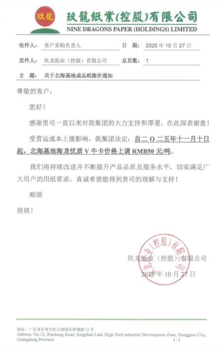 • 江蘇玖森紙業(yè) 自10月25日起,對(duì)我司生產(chǎn)的所有定量高強(qiáng)瓦楞紙進(jìn)行階段提價(jià),在現(xiàn)基礎(chǔ)上漲價(jià) 50 元/噸。