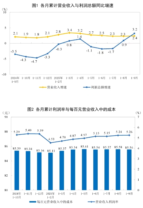 1—9月份,規(guī)模以上工業(yè)企業(yè)實(shí)現(xiàn)營(yíng)業(yè)收入102.08萬(wàn)億元,同比增長(zhǎng)2.4%;發(fā)生營(yíng)業(yè)成本87.34萬(wàn)億元,增長(zhǎng)2.6%;營(yíng)業(yè)收入利潤(rùn)率為5.26%,同比提高0.04個(gè)百分點(diǎn)。其中,造紙和紙制品業(yè)實(shí)現(xiàn)營(yíng)業(yè)收入10375.7億元,同比下降2.1%;印刷和記錄媒介復(fù)制業(yè)實(shí)現(xiàn)營(yíng)業(yè)收入4772.1億元,同比下降2.1%。 9月末,規(guī)模以上工業(yè)企業(yè)資產(chǎn)總計(jì)186.27萬(wàn)億元,同比增長(zhǎng)5.0%;負(fù)債合計(jì)107.96萬(wàn)億元,增長(zhǎng)5.2%;所有者權(quán)益合計(jì)78.31萬(wàn)億元,增長(zhǎng)4.7%;資產(chǎn)負(fù)債率為58.0%,同比上升0.1個(gè)百分點(diǎn)。 9月末,規(guī)模以上工業(yè)企業(yè)應(yīng)收賬款27.22萬(wàn)億元,同比增長(zhǎng)5.7%;產(chǎn)成品存貨6.71萬(wàn)億元,增長(zhǎng)2.8%。 1—9月份,規(guī)模以上工業(yè)企業(yè)每百元營(yíng)業(yè)收入中的成本為85.56元,同比增加0.18元;每百元營(yíng)業(yè)收入中的費(fèi)用為8.36元,同比減少0.16元。 9月末,規(guī)模以上工業(yè)企業(yè)每百元資產(chǎn)實(shí)現(xiàn)的營(yíng)業(yè)收入為74.7元,同比減少1.9元;人均營(yíng)業(yè)收入為185.6萬(wàn)元,同比增加6.2萬(wàn)元;產(chǎn)成品存貨周轉(zhuǎn)天數(shù)為20.2天,同比增加0.2天;應(yīng)收賬款平均回收期為69.2天,同比增加3.3天。 9月份,規(guī)模以上工業(yè)企業(yè)利潤(rùn)同比增長(zhǎng)21.6%。 國(guó)家統(tǒng)計(jì)局工業(yè)司首席統(tǒng)計(jì)師于衛(wèi)寧解讀2025年1—9月份工業(yè)企業(yè)利潤(rùn)數(shù)據(jù)表示,1—9月份,各地區(qū)各部門認(rèn)真落實(shí)更加積極有為宏觀政策,培育壯大新經(jīng)濟(jì)增長(zhǎng)點(diǎn),高技術(shù)制造業(yè)、裝備制造業(yè)等新質(zhì)生產(chǎn)力較快增長(zhǎng),疊加低基數(shù)效應(yīng)影響,規(guī)模以上工業(yè)企業(yè)利潤(rùn)增速繼續(xù)回升。具體表現(xiàn)為:工業(yè)企業(yè)利潤(rùn)加快恢復(fù);工業(yè)企業(yè)營(yíng)收增長(zhǎng)加快;過(guò)半行業(yè)利潤(rùn)增長(zhǎng),六成行業(yè)增速回升;高技術(shù)制造業(yè)帶動(dòng)作用明顯;裝備制造業(yè)支撐有力,部分行業(yè)增長(zhǎng)較快;不同規(guī)模類型企業(yè)利潤(rùn)均有改善,私營(yíng)和外資企業(yè)利潤(rùn)明顯加快;營(yíng)收利潤(rùn)率回升。