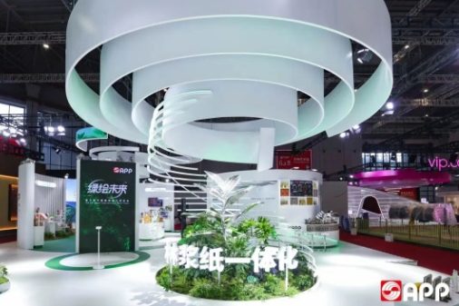 今年,金光集團APP展臺在視覺上延續了一貫的綠色基調。依托“無限共生紙卷"為核心意象,展臺在“未來森林”的光影流轉間,鋪展出一幅以創新與共生為主題的未來畫卷。值得一提的是,展臺整體采用環保材料搭制。