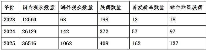 展會介紹 伴隨新質生產力概念的提出與高質量發展步伐的持續加快,油墨產業已在材料、設備、工藝、技術等領域完成多維度變革升級——其高端化、智能化、綠色化轉型成果持續涌現,不僅為產業多領域應用筑牢根基,更推動行業煥發全新生機與活力。 以“綠色油墨・多彩世界”為核心主題,2026鴻威・亞洲油墨工業博覽會定于2026年10月15-17日在廣州空港博覽中心(機場展館)舉辦。展會聚焦新品展覽、論壇研討、洽談交易、實操演示、商機發布五大核心模塊,將打造專業性強、兼具前瞻性的技術交流平臺,助力國內油墨行業加速發展。屆時將力邀海內外油墨應用與生產企業、經銷商、代理商、行業協會、科研院校等業界精英齊聚,全面展現油墨產業立體多元、蓬勃向榮的發展面貌。 往屆回顧 歷屆觀眾、展商數量回顧