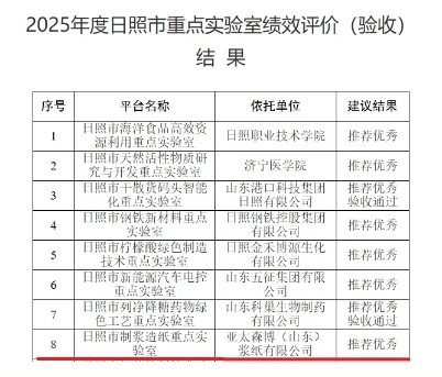 1月12日,日照市科學(xué)技術(shù)局公布了2025年度市重點(diǎn)實(shí)驗(yàn)室績(jī)效評(píng)價(jià)結(jié)果,亞太森博(山東)漿紙有限公司牽頭建設(shè)的日照市制漿造紙重點(diǎn)實(shí)驗(yàn)室憑借扎實(shí)的研發(fā)實(shí)力、豐碩的創(chuàng)新成果及突出的產(chǎn)業(yè)賦能成效,順利通過評(píng)價(jià)并獲推薦優(yōu)秀等次,彰顯了企業(yè)在制漿造紙領(lǐng)域的科技創(chuàng)新引領(lǐng)地位。
