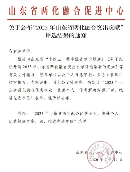 1月15日,山東省兩化融合促進(jìn)中心公布“2025年山東省兩化融合突出貢獻(xiàn)”評(píng)選結(jié)果,公司憑借在兩化融合領(lǐng)域的卓越表現(xiàn),獲評(píng)“山東省兩化融合優(yōu)秀企業(yè)”。