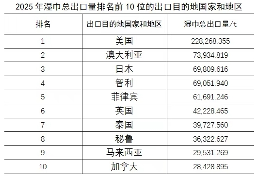 進(jìn)口: 吸收性衛(wèi)生用品總進(jìn)口量自2017年的25.5萬(wàn)t逐年遞減,2025年總進(jìn)口量?jī)H2.38萬(wàn)t。近年來(lái),國(guó)內(nèi)吸收性衛(wèi)生用品產(chǎn)能增長(zhǎng)、品質(zhì)提升,消費(fèi)者對(duì)進(jìn)口產(chǎn)品的需求下降。其中,嬰兒紙尿褲的進(jìn)口量比2024年下降25.55%,在各類(lèi)吸收性衛(wèi)生用品中降幅最大,衛(wèi)生巾產(chǎn)品進(jìn)口量則比2024年增長(zhǎng),已成為進(jìn)口吸收性衛(wèi)生用品中占比最大的品類(lèi)。 濕巾 2025年,中國(guó)濕巾出口量比2024年增長(zhǎng),進(jìn)口量雖微增,但總量較少,濕巾出口量遠(yuǎn)高于進(jìn)口量。 出口: 2025年,濕巾的總出口量為100.90萬(wàn)t,比2024年增長(zhǎng)20.91%。出口產(chǎn)品以清潔濕巾為主,出口量占比為83.73%。(注:目前,在海關(guān)的商品編碼中將清潔濕巾歸入34011990.消毒濕巾歸入38089400.但是這兩個(gè)編碼下不只是濕巾產(chǎn)品,還包括其他清潔、消毒產(chǎn)品。)