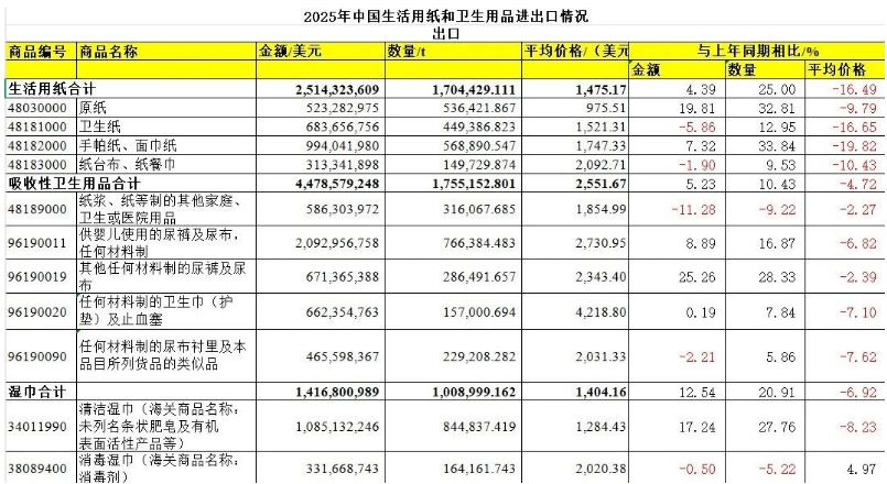生活用紙 根據(jù)海關(guān)統(tǒng)計(jì)數(shù)據(jù),2025年,中國(guó)生活用紙出口量連續(xù)4年增長(zhǎng),進(jìn)口量雖也有增長(zhǎng),但總量相對(duì)較少。中國(guó)生活用紙市場(chǎng)以出口為主,國(guó)內(nèi)生活用紙產(chǎn)量和產(chǎn)品種類(lèi)已經(jīng)能夠滿(mǎn)足本地市場(chǎng)需求,進(jìn)口產(chǎn)品對(duì)國(guó)內(nèi)市場(chǎng)影響微小。 出口: 2025年,生活用紙總出口量達(dá)到170.44萬(wàn)t,比2024年增長(zhǎng)25.00%;出口金額為25.14億美元,比2024年增長(zhǎng)4.39%;出口平均價(jià)格比2024年下降16.49%,出口呈現(xiàn)量增價(jià)減的趨勢(shì)。