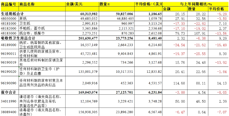 出口的生活用紙仍以成品紙(衛(wèi)生紙、手帕紙、面巾紙、餐巾紙等)為主,占生活用紙總出口量的68.53%。其中,衛(wèi)生紙占總出口量的26.37%,占比呈逐年下降趨勢(shì)(2024年為29.18%,2023年為30.12%),手帕紙、面巾紙的占比為33.38%(2024年為31.17%),在成品紙出口品類(lèi)中占比最大,紙臺(tái)布、餐巾紙的占比為8.78%,比2024年略有下降。 進(jìn)口: 2025年,生活用紙全年總進(jìn)口量?jī)H為5.08萬(wàn)t,進(jìn)口的生活用紙以原紙為主,占比為92.24%。 吸收性衛(wèi)生用品 中國(guó)吸收性衛(wèi)生用品出口量多年來(lái)保持平穩(wěn)增長(zhǎng),進(jìn)口量則不斷下滑。2025年,吸收性衛(wèi)生用品的總出口量已遠(yuǎn)高于總進(jìn)口量,國(guó)產(chǎn)的產(chǎn)品能夠滿(mǎn)足國(guó)內(nèi)市場(chǎng)需求,中國(guó)一次性衛(wèi)生用品在國(guó)際市場(chǎng)的影響力和競(jìng)爭(zhēng)力不斷增強(qiáng)。 出口: 2025年吸收性衛(wèi)生用品的總出口量達(dá)175.52萬(wàn)t,比2024年增長(zhǎng)10.43%,出口金額達(dá)44.79億美元,比2024年增長(zhǎng)5.23%。女性衛(wèi)生用品、嬰兒紙尿褲、成人失禁用品的出口量均有不同程度的增長(zhǎng)。嬰兒紙尿褲在吸收性衛(wèi)生用品出口量中占比最大,為43.66%。