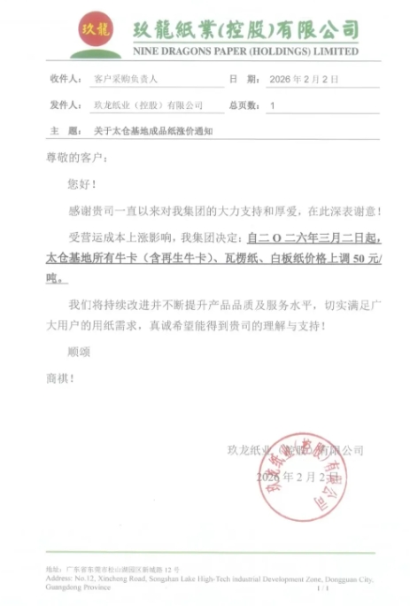 自三月二日起,沈陽基地所有牛卡(含再生牛卡)、瓦楞紙價格上調 50元/噸。