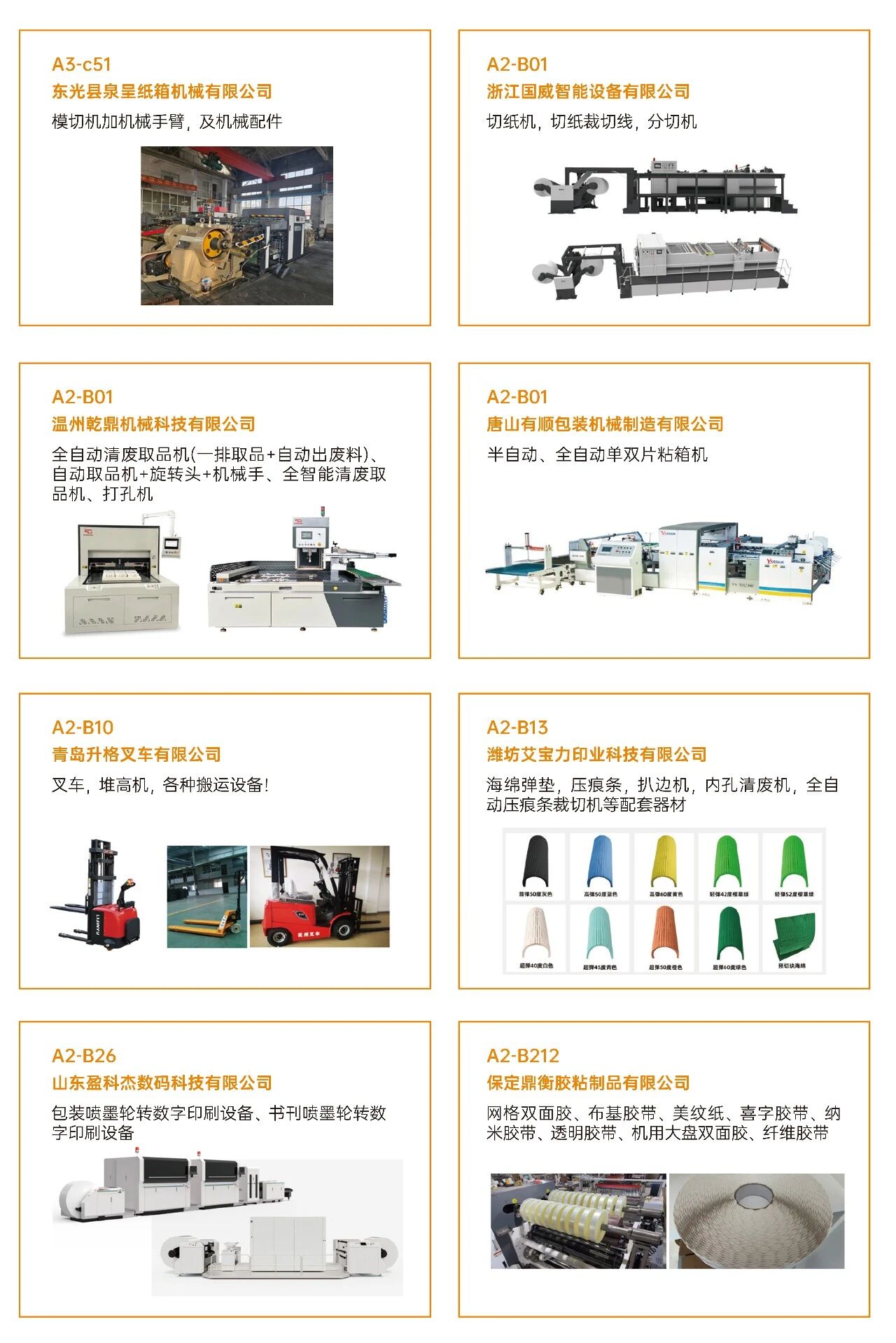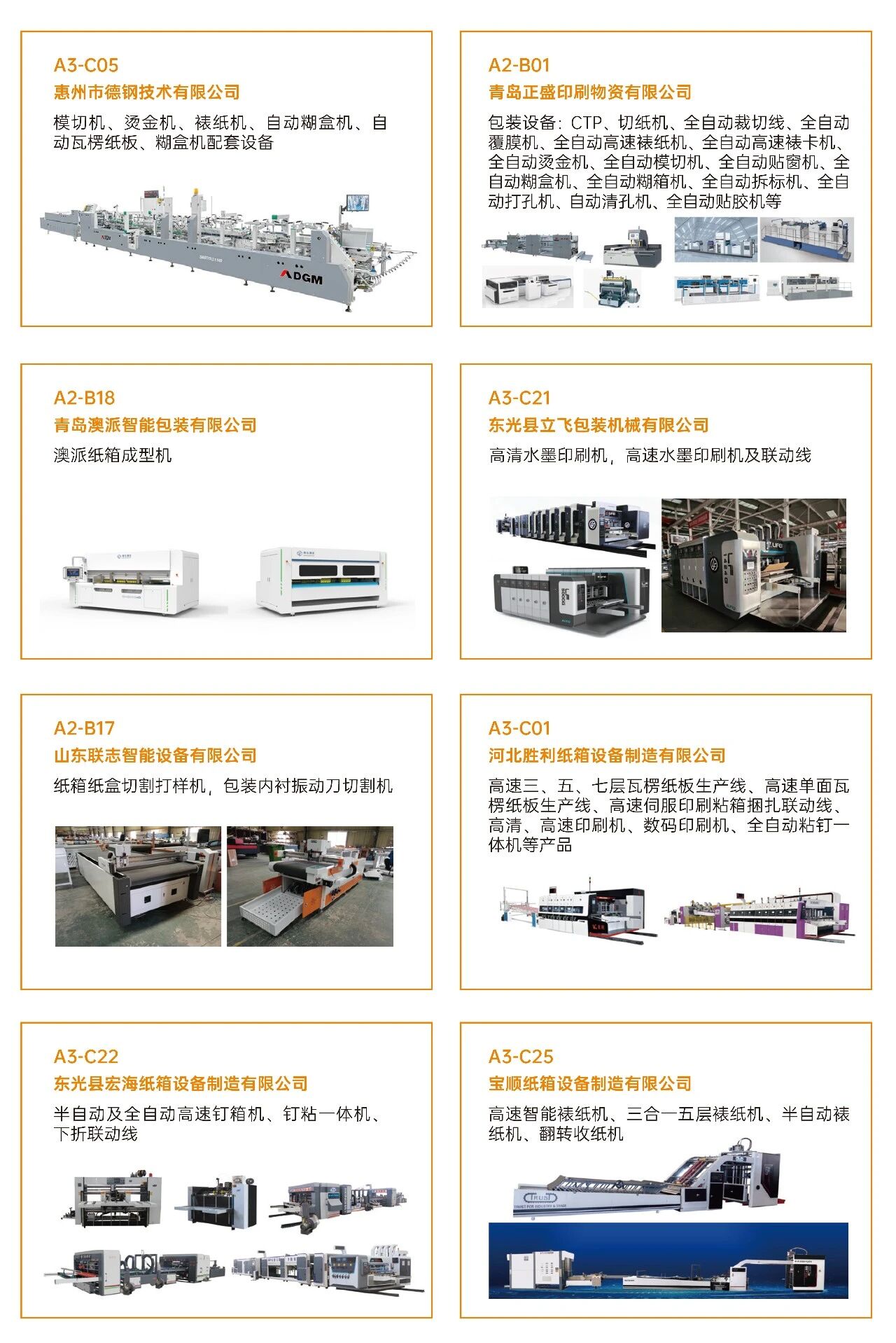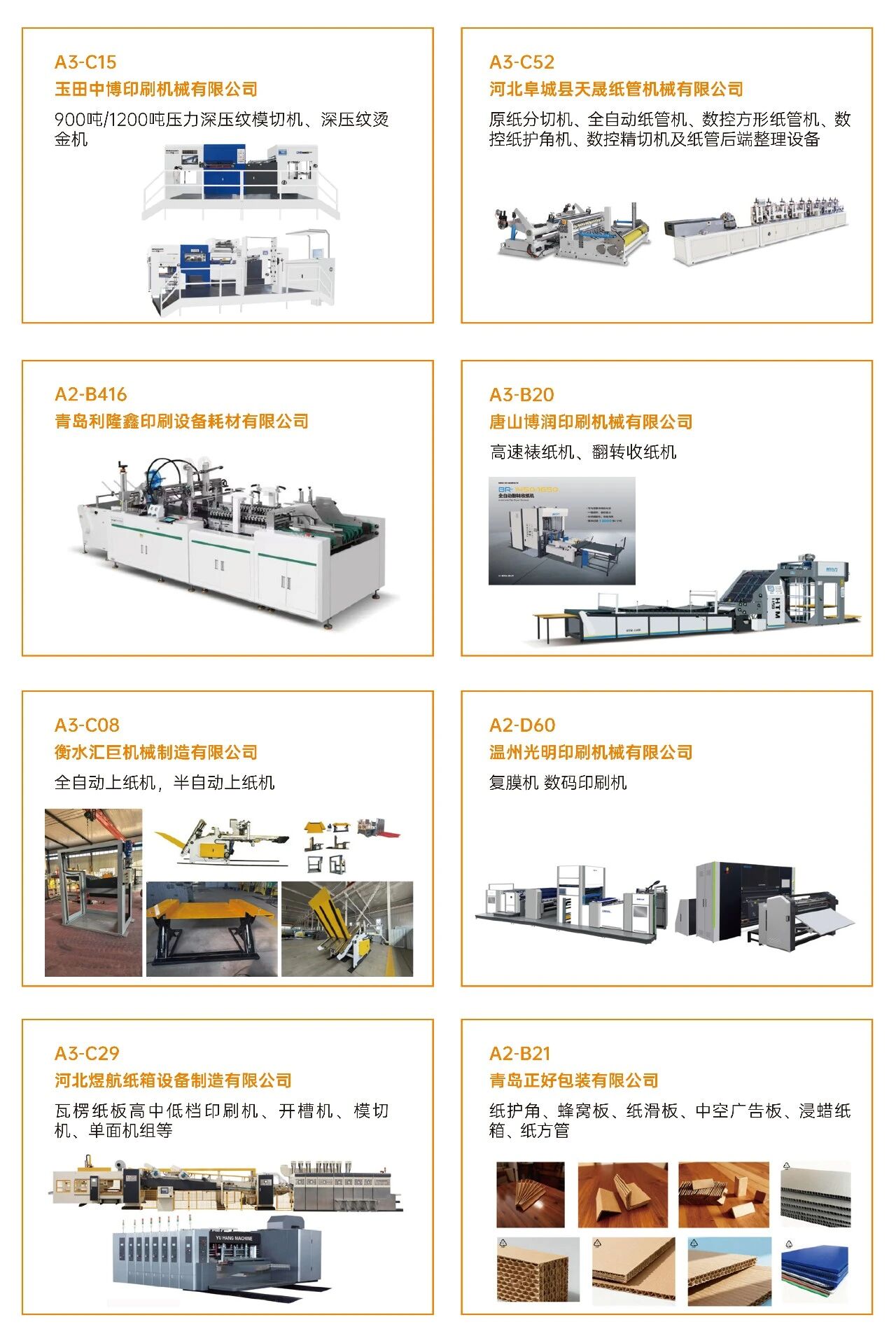 ·瓦楞紙箱/彩盒機械:瓦楞機、復瓦機、分紙機、接紙機、壓痕機、縱切機、開槽機、粘箱機、釘箱機、制膠機、瓦楞輥、硬盒加工設備及其它設備。