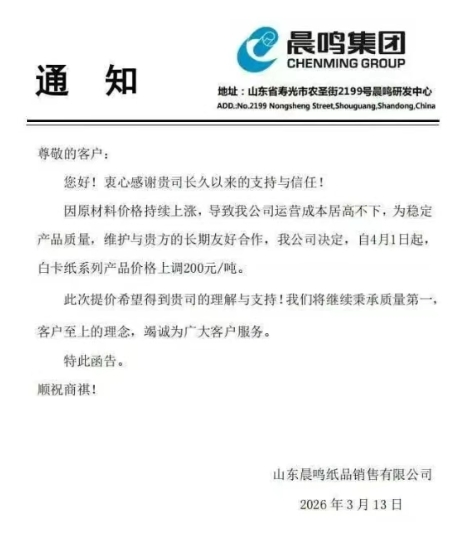 山東晨鳴紙品銷售有限公司發(fā)布漲價函,因原材料價格持續(xù)上漲,公司決定,自4月1日起,白卡紙系列產(chǎn)品價格上調(diào)200元/噸。