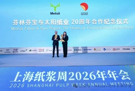 芬林芬寶打造高效的全球物流網絡 在本屆上海紙漿周期間,芬林芬寶與太陽紙業共同舉行了合作 20 周年慶祝儀式,紀念雙方不斷深化的伙伴關系。太陽紙業與芬林芬寶長期以來在綠色制造、責任供應鏈與長期戰略發展等多個領域保持緊密合作。儀式上,雙方負責人互贈紀念品,共同回顧了這段基于互信與共同價值觀的合作歷程。