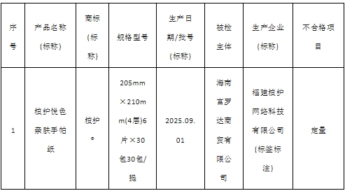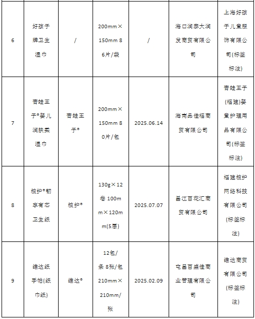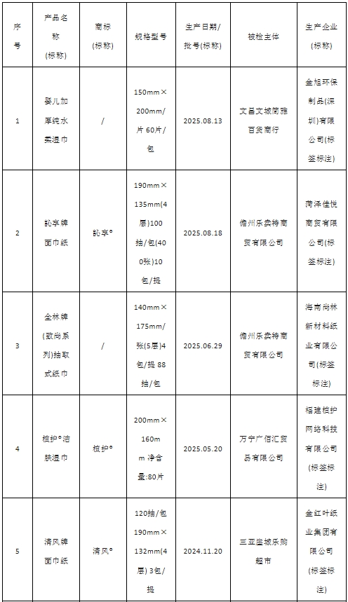 2025年海南省流通領域生活用紙產品質量監督抽查所檢項目符合相關標準的產品